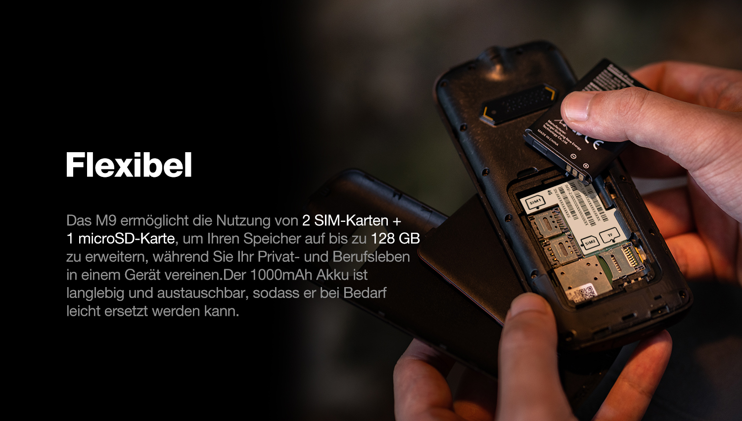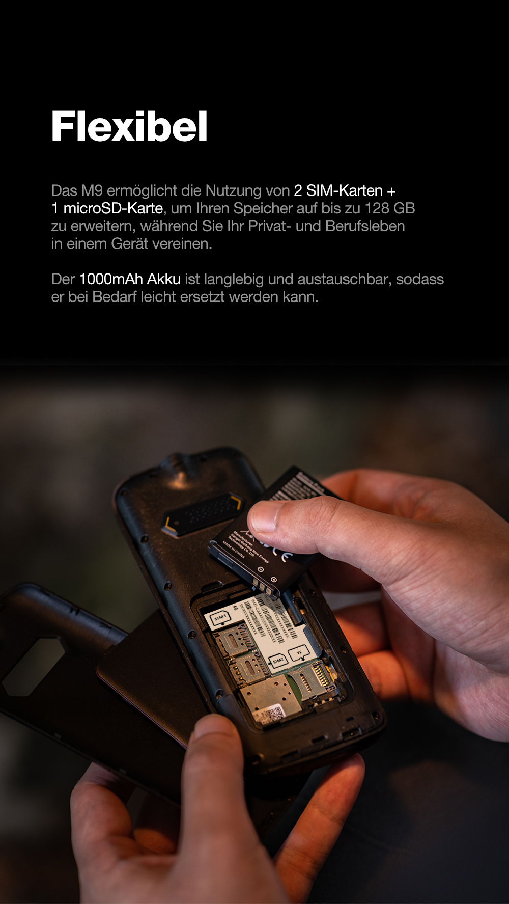 Nutzen Sie die Flexibilität von 2 SIM-Karten und 1 microSD-Karte (erweiterbar bis 128 GB). Damit können Sie Ihr Privat- und Berufsleben problemlos trennen. Der 1200 mAh Akku ist zudem austauschbar.