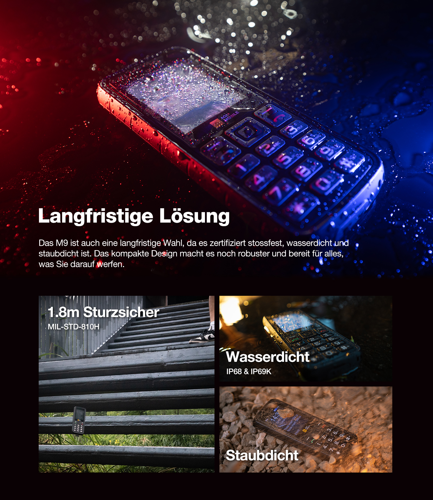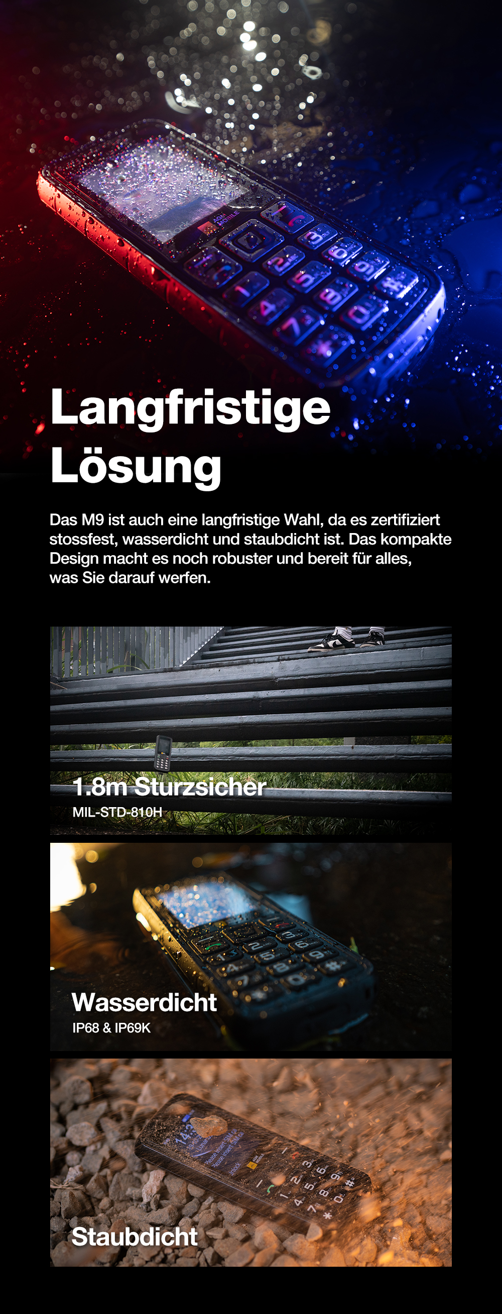 - 1,8 m sturzsicher (MIL-STD-810H Zertifizierung)