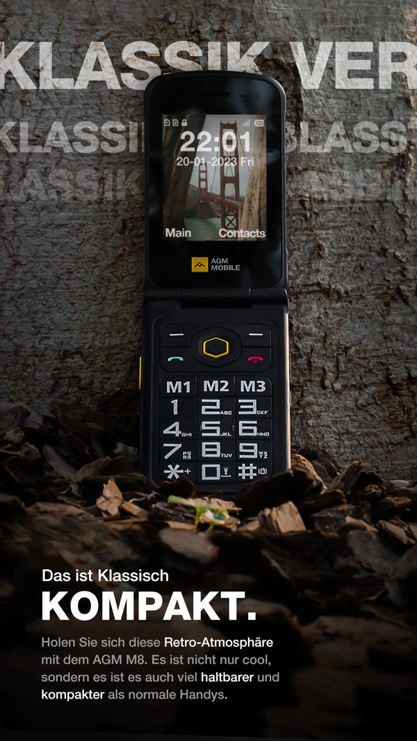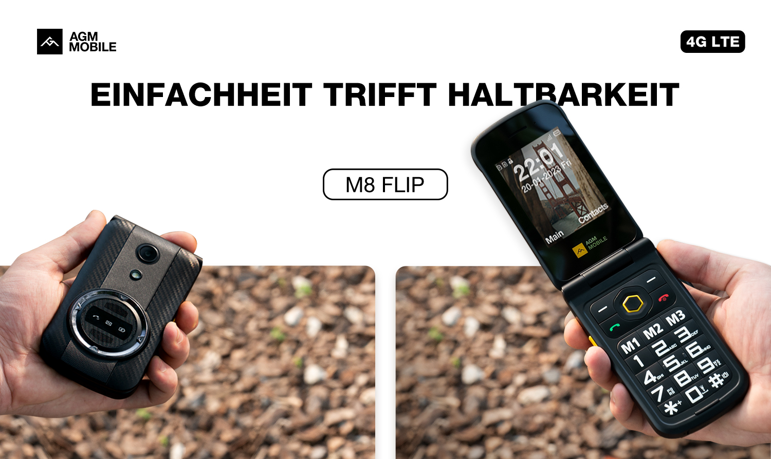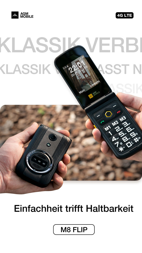 | AGM M8 Flip | 2,8" + 1,77" | 1500 mAh | IP68/69 | ✘ | 4G VoLTE, Notruftaste |