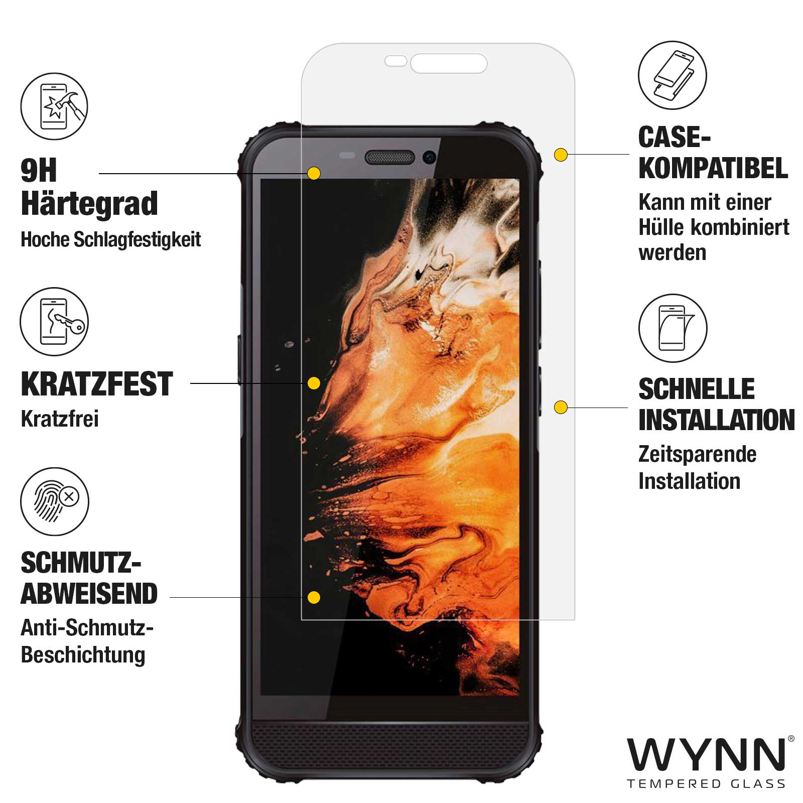 Alle WYNN Schutzgläser sind kratzfest, case-kompatibel und lassen sich dank Montagehilfsrahmen einfach anbringen. Verfügbar für iPhone, Samsung, AGM, Google, Huawei und OnePlus.