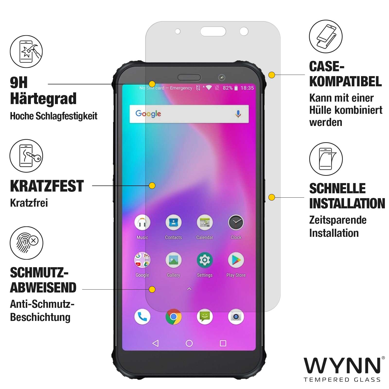 Alle WYNN Schutzgläser sind kratzfest, case-kompatibel und lassen sich dank Montagehilfsrahmen einfach anbringen. Verfügbar für iPhone, Samsung, AGM, Google, Huawei und OnePlus.